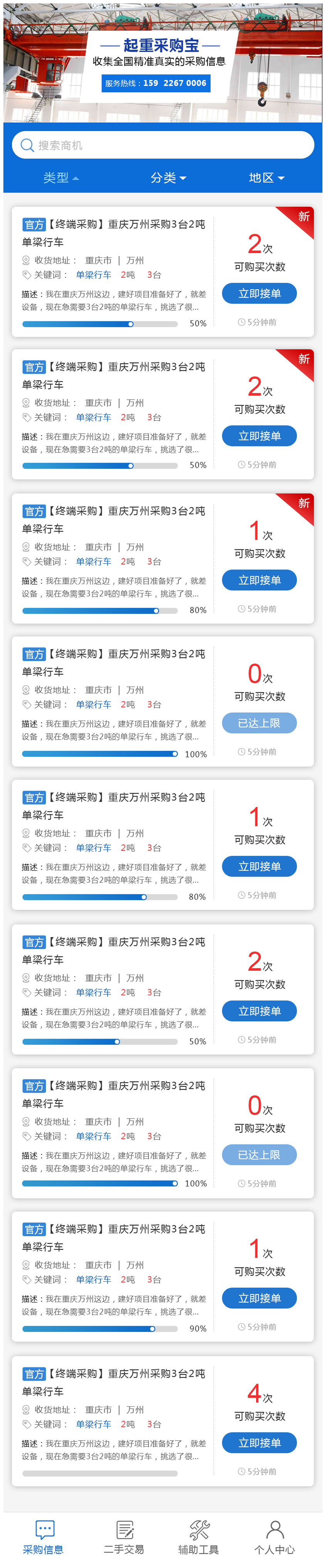 欢迎您关注起重采购宝,我们每天为您实时推送全国各地真实有效的起重设备采购信息,让您直接面对终端采购客户,起重采购宝助您生意更上一层楼!